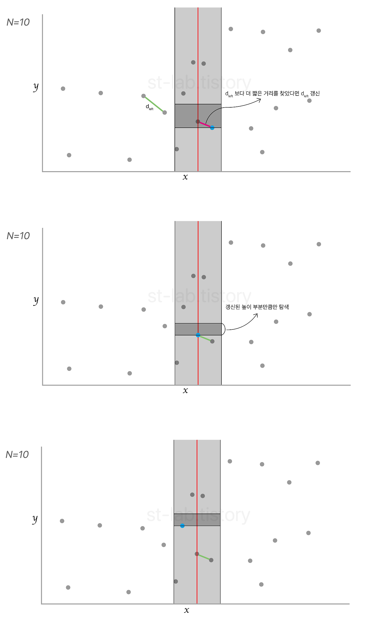 이때, 그 영역안에 있는 추려낸 점들을 다른 축을 기준으로 정렬한다. 만약 처음에 y축 기준으로 정렬 했다면, 이번엔 x축 기준으로 정렬, x축이면 y축 기준으로 정렬하여 비교를 하면 현재 최소거리보다 가까운 점들만 비교하여 더 빠르게 계산할 수 있다.